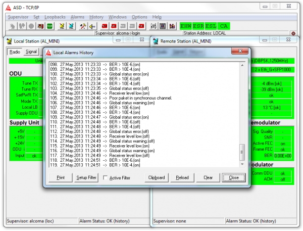 Dohledový program ASD Client představuje univerzální řešení pro dohled a snadnou správu všech jednotek ALCOMA v síti. Jedná se o aplikaci pro prostředí MS Windows, která přináší zásadní výhody oproti běžně používaným webovým dohledům. Monitoring je zde prováděn v reálném čase, není tedy třeba obnovovat stránku nebo čekat na refresh, každá změna na spoji se okamžitě projeví v dohledové aplikaci. Dohledový systém umožňuje spravovat mikrovlnný spoj jako celek, tzn. jak místní, tak i vzdálený konec spoje najednou, informace z obou jednotek jsou zobrazovány současně. Pro přenos stavových a servisních signálů mezi oběma body spoje navzájem se využívá plně duplexní synchronní komunikační kanál. Vzhledem k této koncepci je možné komunikovat s protistranou i v případě, kdy ethernetové spojení již díky vysoké chybovosti nefunguje. Servisní kanál je schopný přenášet data až do chybovosti 10-2, kdežto komunikace po Ethernetu se začíná rozpadat při chybovosti cca 10-6. To vnímáme jako velkou výhodu oproti konkurenčním produktům s dohledem pouze Ethernetovými kanály. Zároveň je možné například na dálku vypnout vysílač protistrany a následně si ho opět zapnout, to vše naprosto jednoduše.